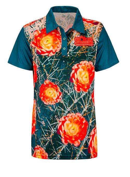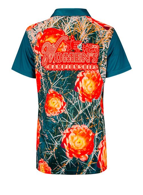 Ladies polo features left chest Women's Championships 2020 logo on full front and back sublimated green and red floral design with green collar, sleeves, and button placket.