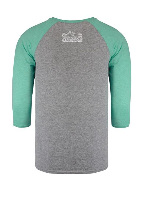 Grey raglan t-shirt features 2020 Women's Championships design with mint green raglan sleeves.