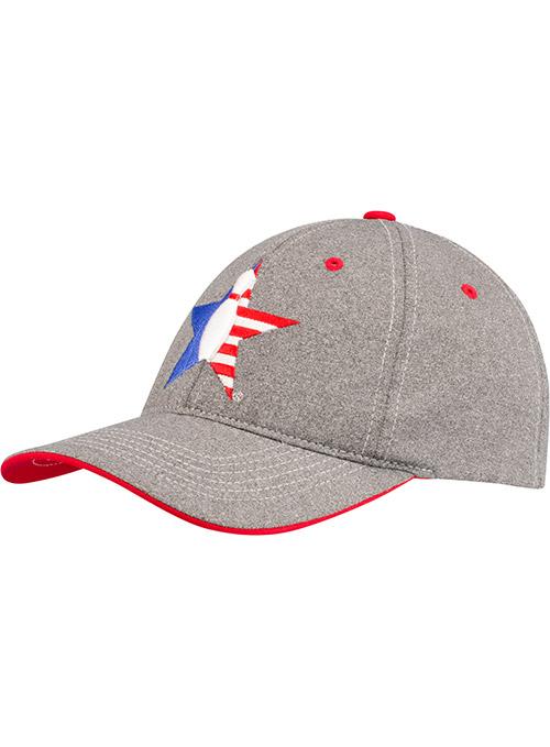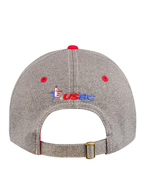 Heathered grey cotton jersey hat features full color USBC Pinstar as 3D embroidery centered on front panels with red detailing and white stitching. Adjustable buckle closure helps one size to fit all.