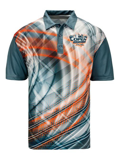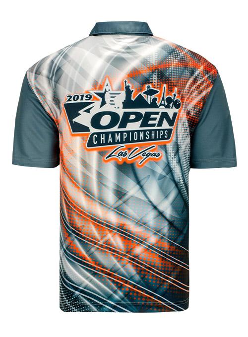Adult sublimated polo in teal, grey, and bright orange features full front graphics with USBC Open Championships logo on the left chest, full back graphics with Open Championships logo across shoulders, and coordinating solid sleeves and collar. Polo has three button placket.
