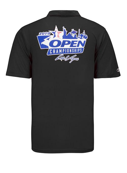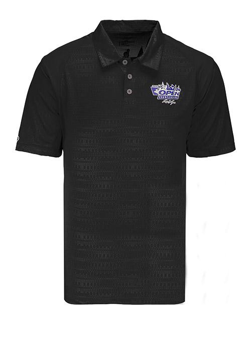 Front embossed print polo features a front left chest 2019 Open Championships heat seal and flat mesh back with 2019 Open Championships logo across the shoulders.
