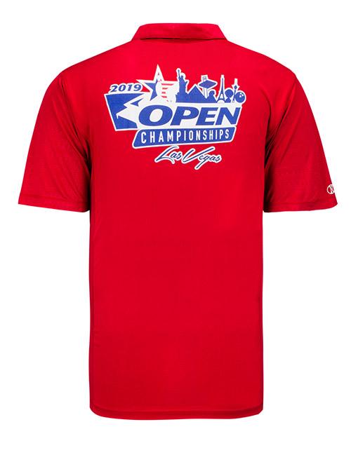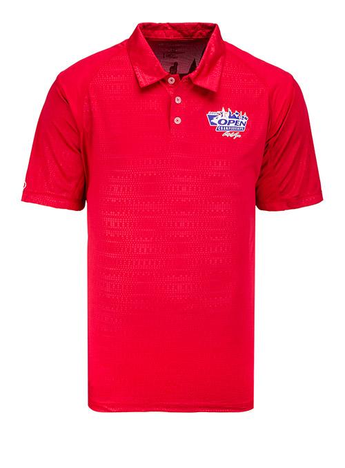 Front embossed print polo features a front left chest 2019 Open Championships heat seal and flat mesh back with 2019 Open Championships logo across the shoulders.