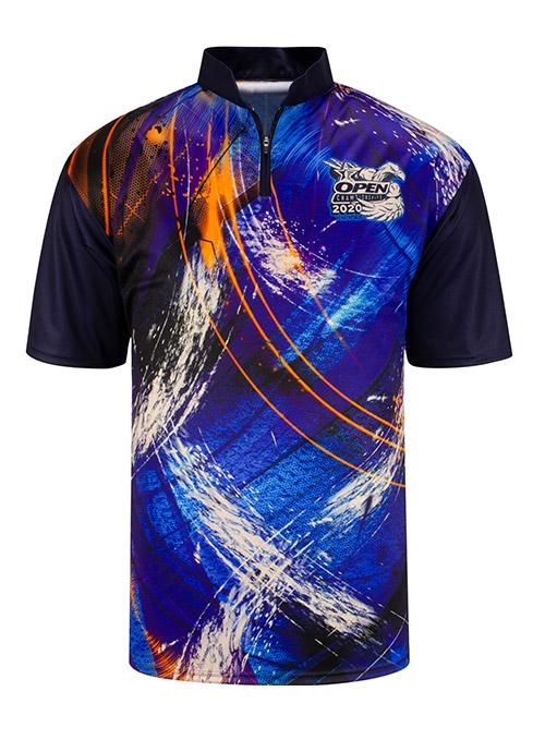 Adult sublimated polo in purple and navy features full front graphics with USBC Open Championships logo on the left chest, full back graphics with Open Championships logo across shoulders, and coordinating sleeves and collar. Polo has zipper placket.