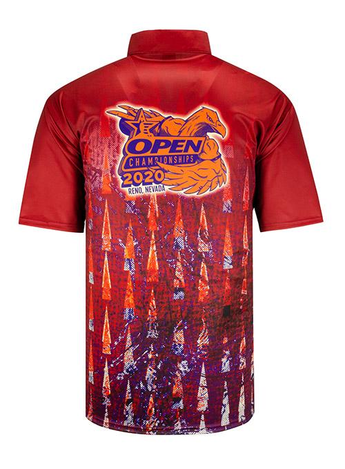 Adult sublimated polo in maroon features full front arrow graphics with USBC Open Championships logo on the left chest, full back graphics with Open Championships logo across shoulders, and coordinating maroon sleeves and collar. Polo has zipper placket.