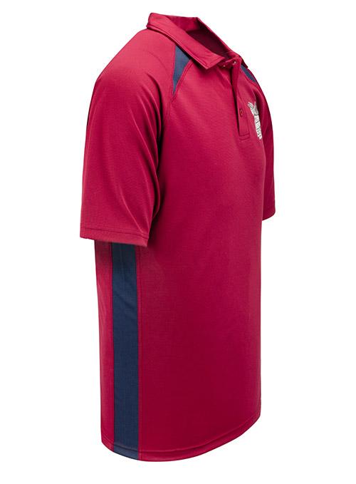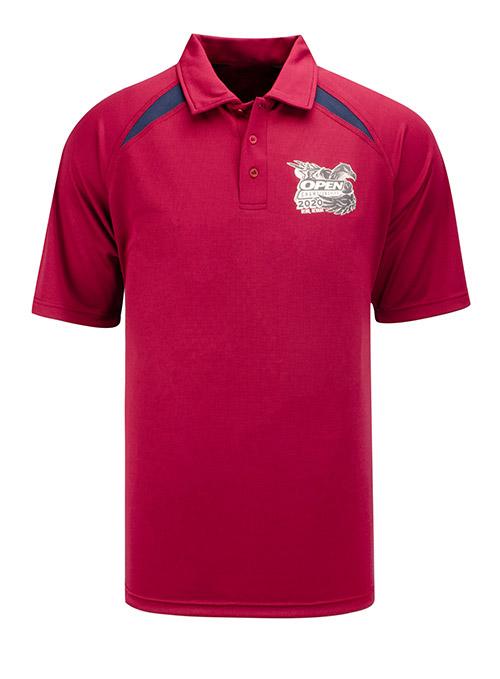 Maroon adult polo features Open Championships 2020 heat seal on left chest and navy insets with a zippered placet.