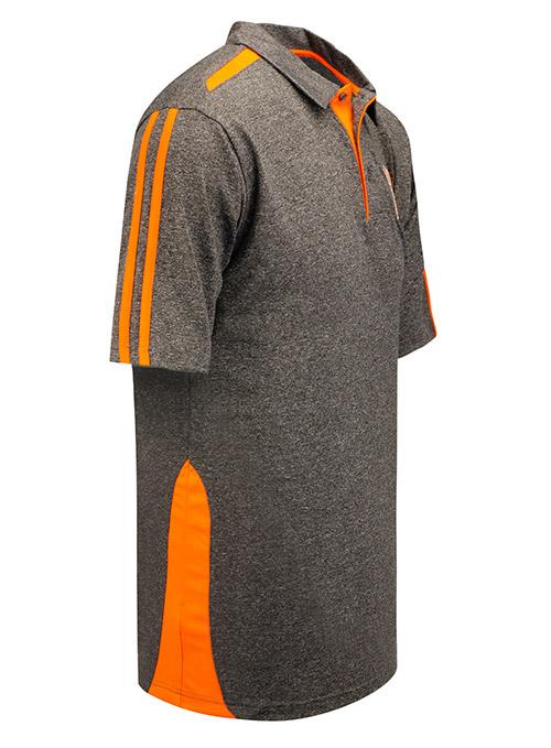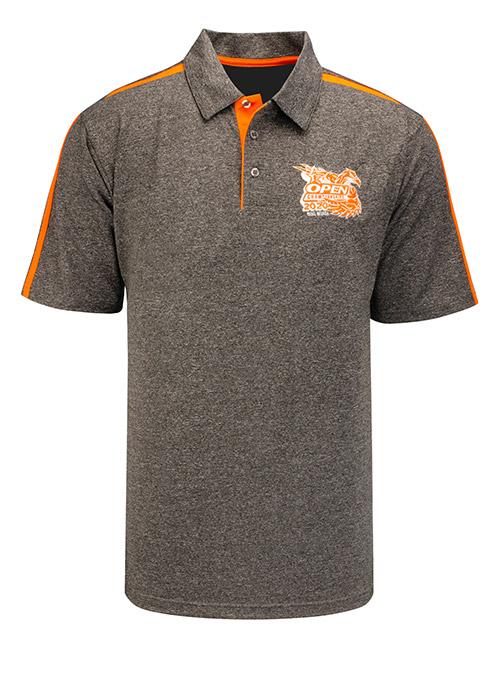 Heather grey adult polo features Open Championships 2020 embroidered logo on left chest and orange insets with a zippered placket.