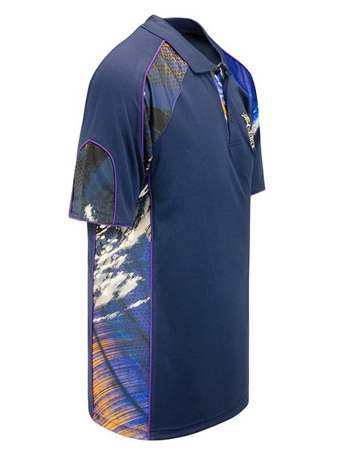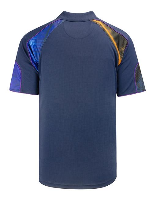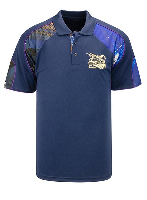 Navy adult polo features Open Championships 2020 embroidered logo on left chest and multicolored insets with a zippered placket.
