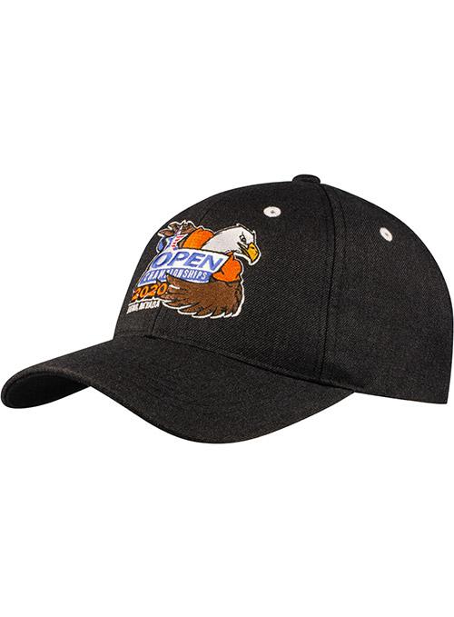 Black performance hat feautures full color USBC Open Championships logo as av3D embroidery center on front panels with white detailing. Adjustable velcro closure helps one size to fit all.