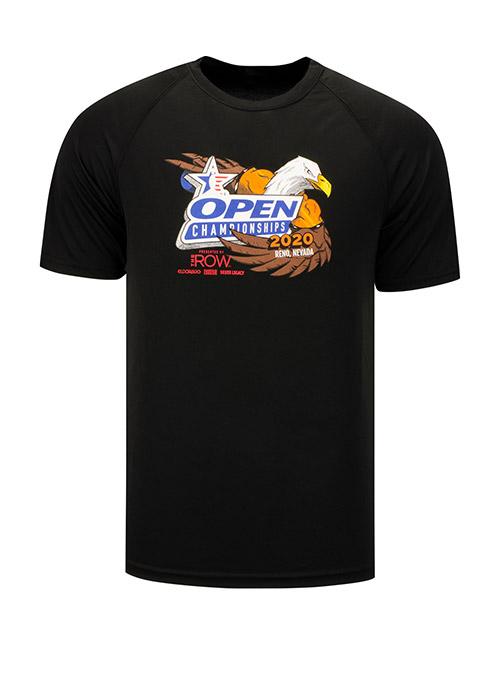 Black t-shirt features 2020 Open Championships logo on front and a pinsplash design on the back.