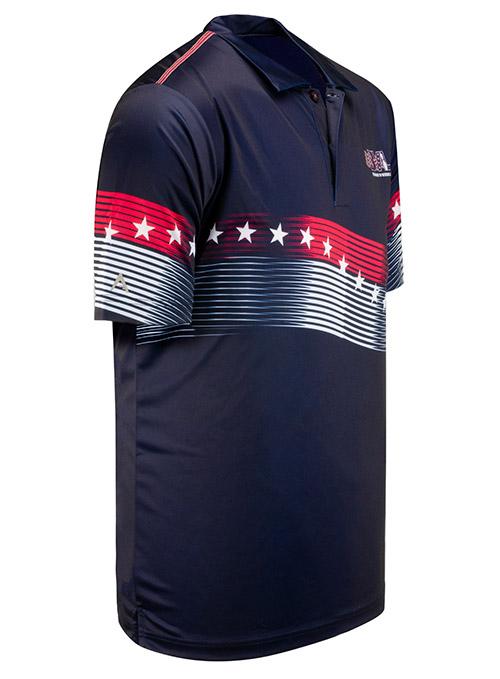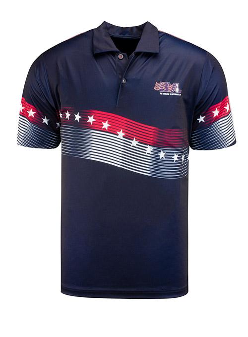 Navy blue partially sublimated mens polo. Decorated with a left chest BVL logo heat seal.