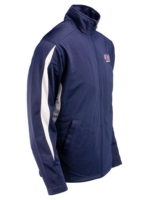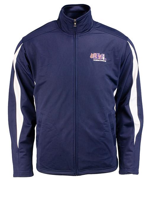 Navy performance jacket decorated with a left chest BVL logo heat seal.